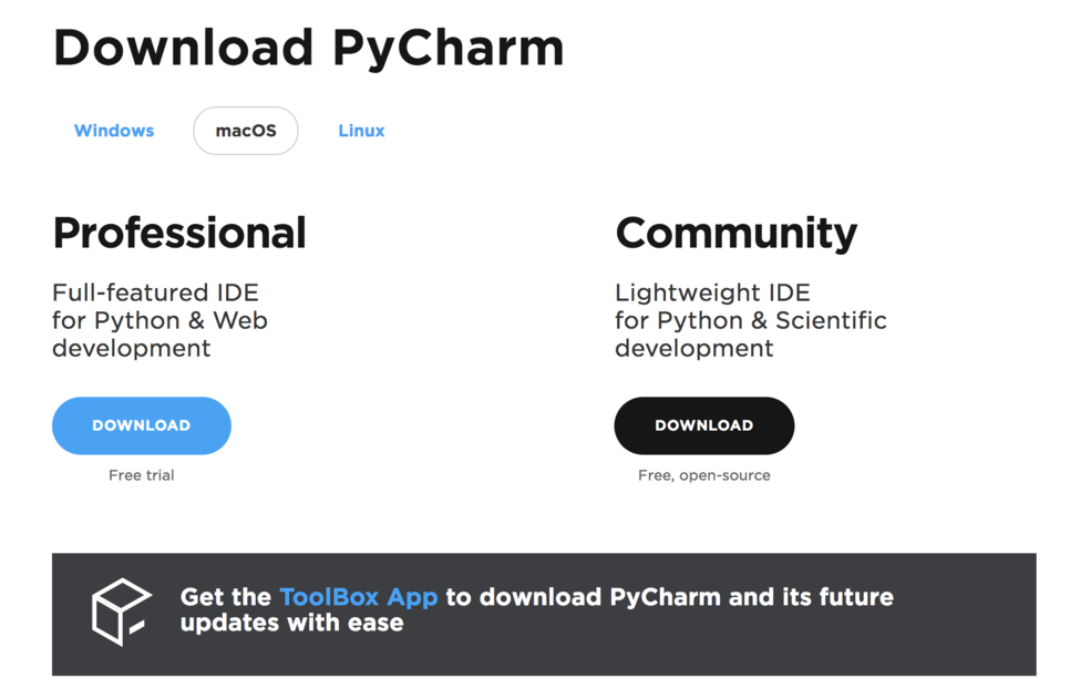 파이참은 유료버전인 "Professional"과 무료버전인 "Community"가 제공된다. 개인적인 파이썬 스터디를 위한 용도이므로 Community 버전으로 충분하다. 상업적으로 이용할 경우엔 관련 라이센스를 잘 살펴보기 바란다.