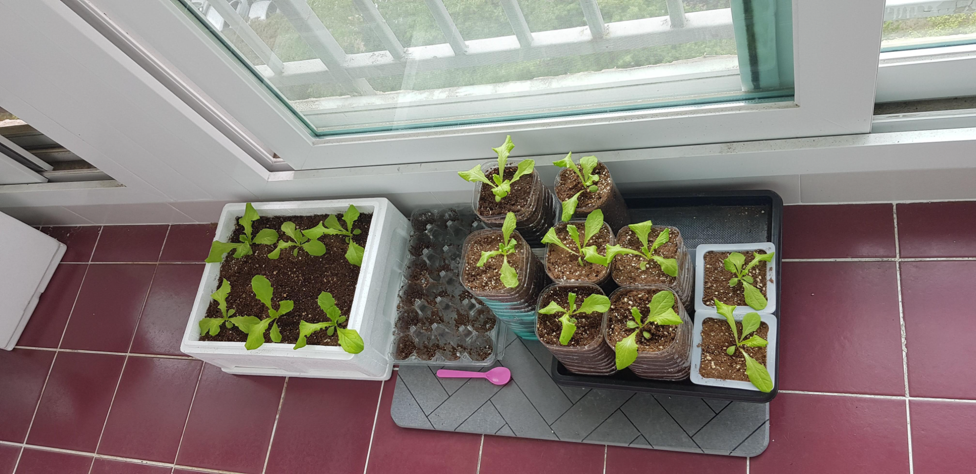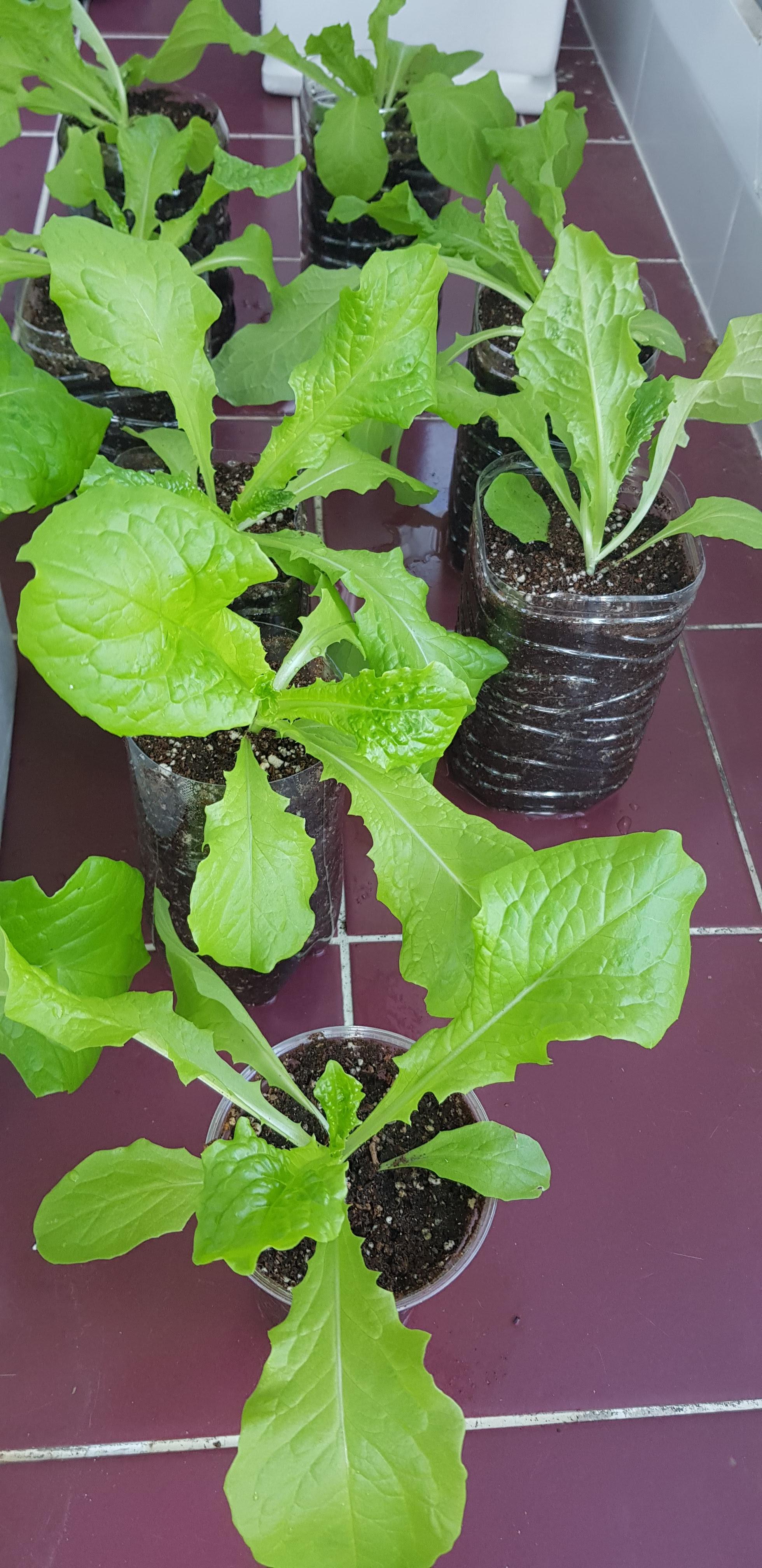 그 사이 남은 상추모를 심기 위해 페트병을 모았고, 페트병으로 화분을 만들어서 옮겨 심었습니다. 맨 오른쪽에는 치킨무 통에다가 심어봤는데 깊이가 깊지 않아서 그런지 자라는 속도가 시원치 않았고, 결국 페트병에다가 다시 옮겨 심었습니다.