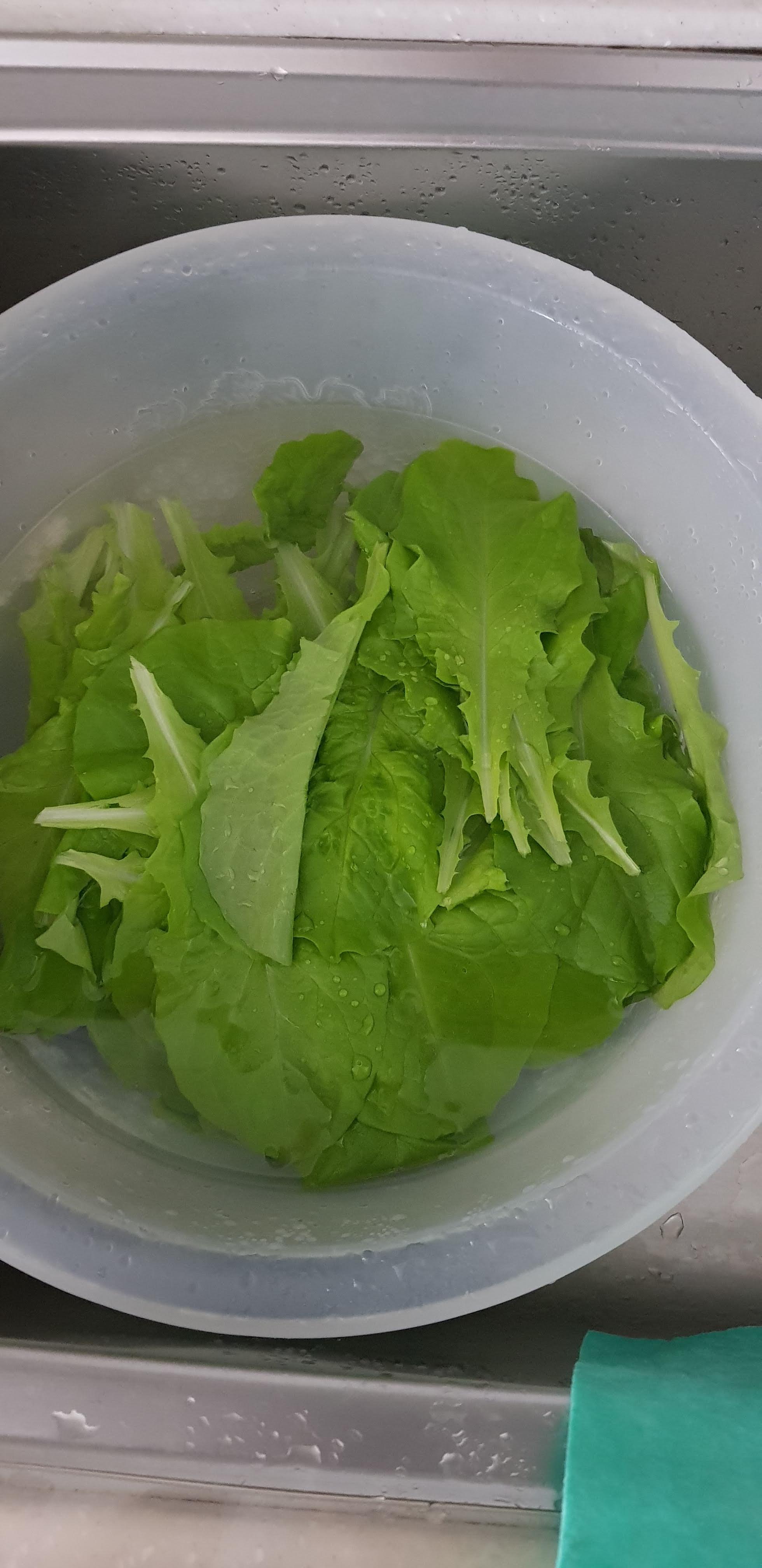 수확한 상추를 물에 담궈둡니다. 시들시들한 상추잎을 약간 미지근한 물에다가 담궈두면 생기가 살아난다고 합니다. 먹기 직전에 물에 담궈두도록 합시다.