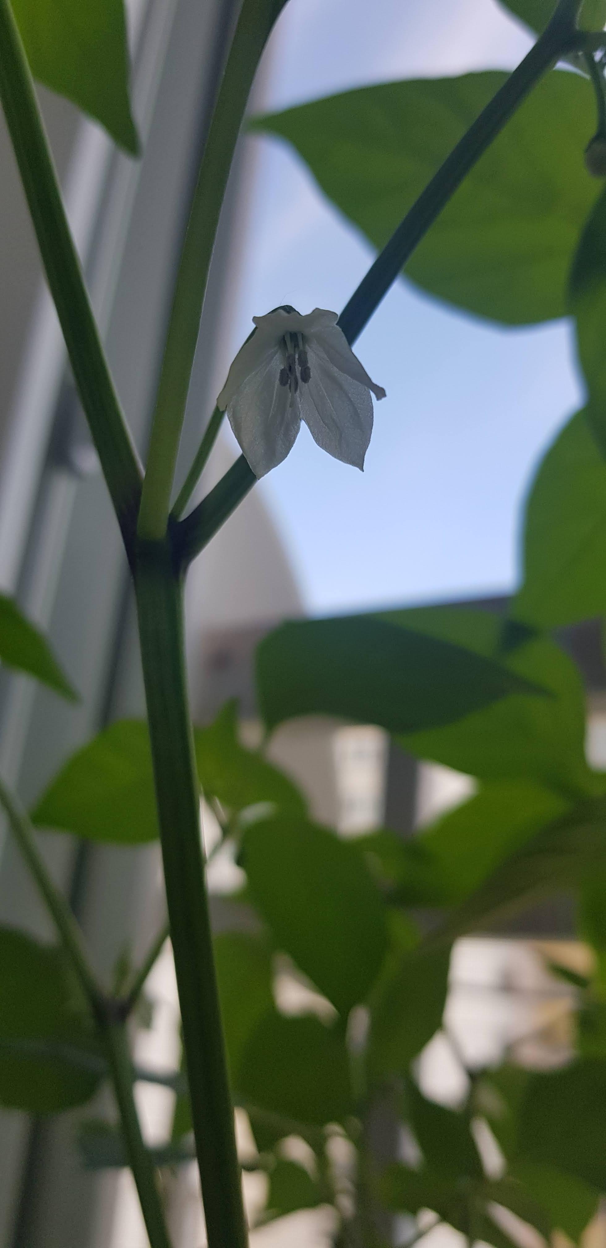 예쁘게 피어난 고추꽃입니다. 고추꽃은 암술과 수술이 한 꽃에 같이 있습니다. 따라서 나비와 벌이 찾아오지 않더라도 바람에 흔들리면서 자연스럽게 수정이 됩니다. 만약 베란다 문을 안열어두신다면 고추나무를 툭툭 쳐주기만해도 됩니다.