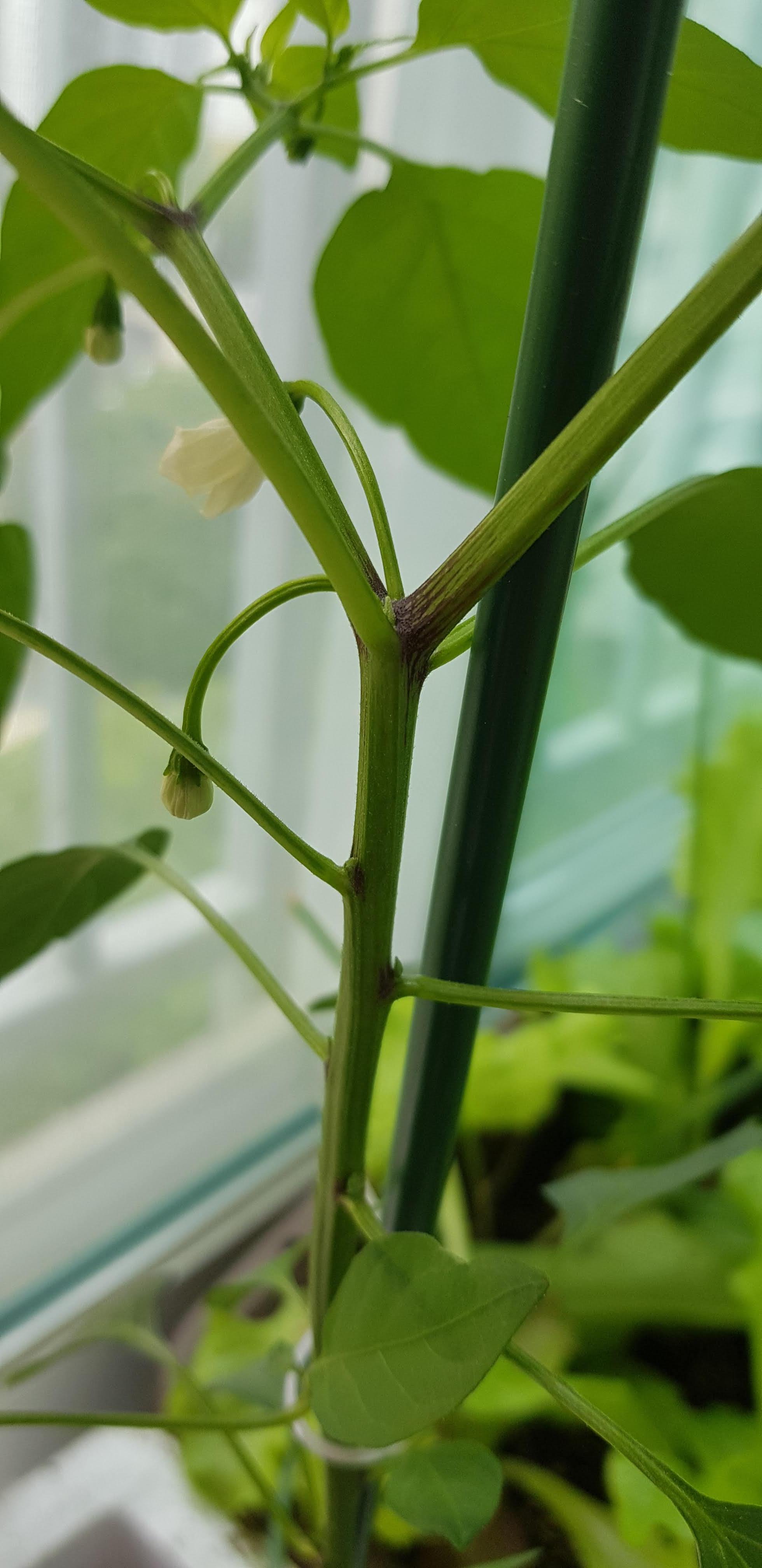 어린 묘목이 점점 자라더니 방아다리에 꽃이 피고 곁순이 생기기 시작했습니다. 5월 31일에 방아다리에 핀 꽃을 제거하고, 곁순도 모두 제거해줬습니다. 무럭무럭 자라나라는 의미입니다. (관련글 : [텃밭] 고추 방아다리, 곁순 제거하기 )